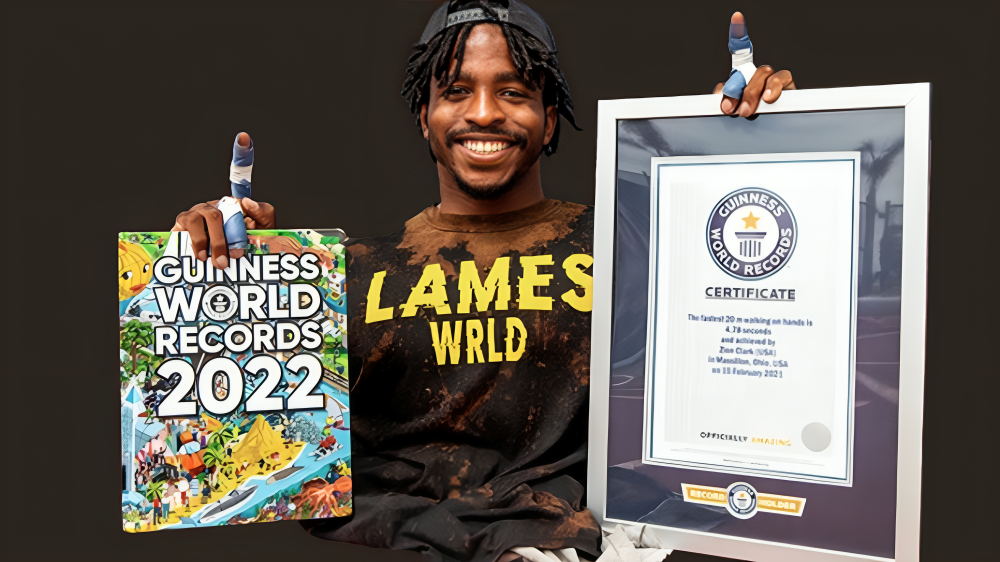 He set three world records by sprinting 20 meters on his hands, performing a high jump using his hands, and doing diamond pushups in 3 minutes.